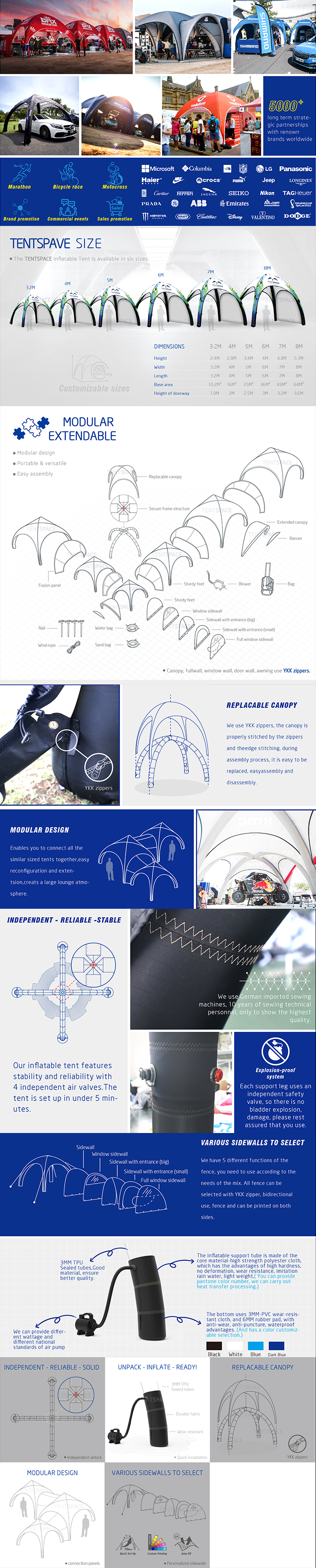 A: Inflatable event tents are lower cost products that need constant blowing comparing with sealed tents, which sealed inflatable tents are using heat welding technology and tent can keep stay after inflation.